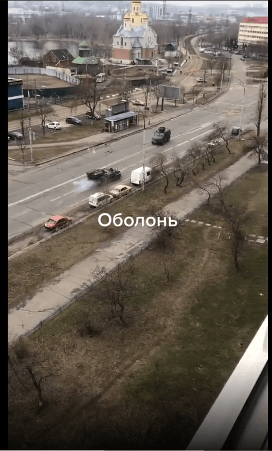 dincolo de blindatul rusesc, sunt mașini civile și blocuri civile – de unde se și filmează (țeava blindatului este spre „H”-ul blocului lung din harta de mai sus). În spatele blindatului ucrainean (la 20-30 metri) sunt trei civili care încearcă să se adăpostească. Fumul de pe asfalt este provocat de gloanțele blindatului ucrainean.